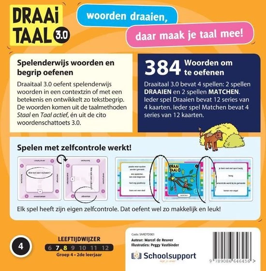 Met DraaiTaal 3.0 groep 4 breiden kinderen in groep 4 spelenderwijs hun woordenschat uit. Met de woordenkeuze sluiten we aan bij zowel de nieuwste citotoetsen Woordenschat als de meest gebruikte taalmethoden, Staal en Taal actief.