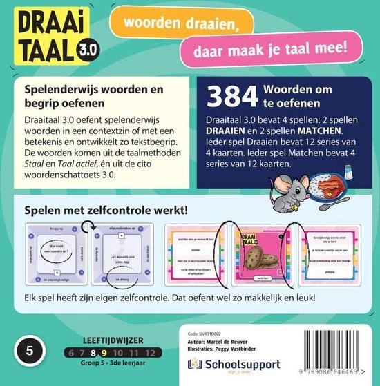Met DraaiTaal 3.0 groep 5 breiden kinderen in groep 5 spelenderwijs hun woordenschat uit. Met de woordenkeuze sluiten we aan bij zowel de nieuwste citotoetsen Woordenschat als de meest gebruikte taalmethoden, Staal en Taal actief.