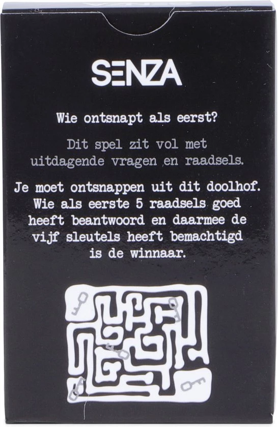 Wie ontsnapt als eerst? Dit spel zit vol met uitdagende vragen en raadsels. Je moet ontsnappen uit het doolhof. Wie als eerste 5 raadsels goed heeft beantwoord en daarmee de vijf sleutels heeft bemachtigd is de winnaar! Dit uitdagende spel mag zeker niet ontbreken tijdens een gezellige avond met familie en/of vrienden.