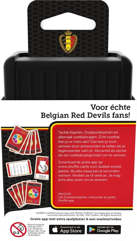 Tackle Kaarten, Doelpuntkaarten en allemaal voetbalvragen in Shuffle GO Trivial Pursuit Rode Duivels. ?cht voetbal. Ken je niets van voetbal? Dan kan je toch winnen door antwoorden te stelen als je tegenstander vast zit. Verzamel als eerste de zes voetbalcategorie?n om te winnen.