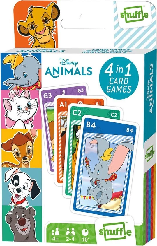 Met dit kaartspel kun je maar liefst vier verschillende spellen spelen. Op de kaarten staan jouw favoriete Disney dieren om het spel nog leuker te maken! Bij de verpakking zit een handleiding waarop de vier spellen worden uitgelegd.