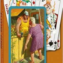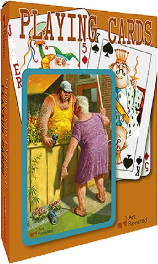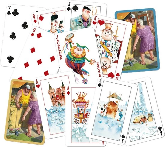 Dubbel kaartspel met standaard kaarttekens én grappige illustraties van Marius van Dokkum. Op de achterzijde van de kaarten zien we de afbeelding van het schilderij “De Druppel”. Het kaartspel is verpakt in een rijk geïllustreerd bewaardoosje. Al met al een uniek kaartspel dat geschikt is voor diverse gezelschapspellen. Gegarandeerd plezier met dit originele kaartspel Marius van Dokkum!