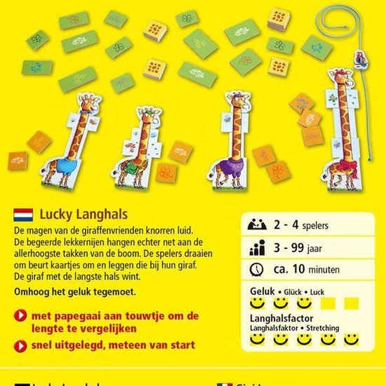 - Inhoud: 4 giraffenkoppen, 4 giraffenlichamen, 24 halskaartjes, 1 papegaai, 1 touwtje, 24 symboolkaartjes,1 handleiding.