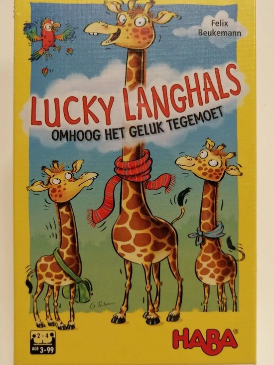 Met spel Lucky langhals ga je omhoog, het gelukt tegemoet! Een plezierig legspel, snel uitgelegd om meteen van start te gaan. De magen van de giraffenvrienden knorren luid. De begeerde lekkernijen hangen echter net aan de allerhoogste takken van de boom. De spelers draaien om beurt kaartjes om en leggen die bij hun giraf. Met de papegaai aan het touwtje vergelijk je de lengte. De giraf met de langste hals wint.