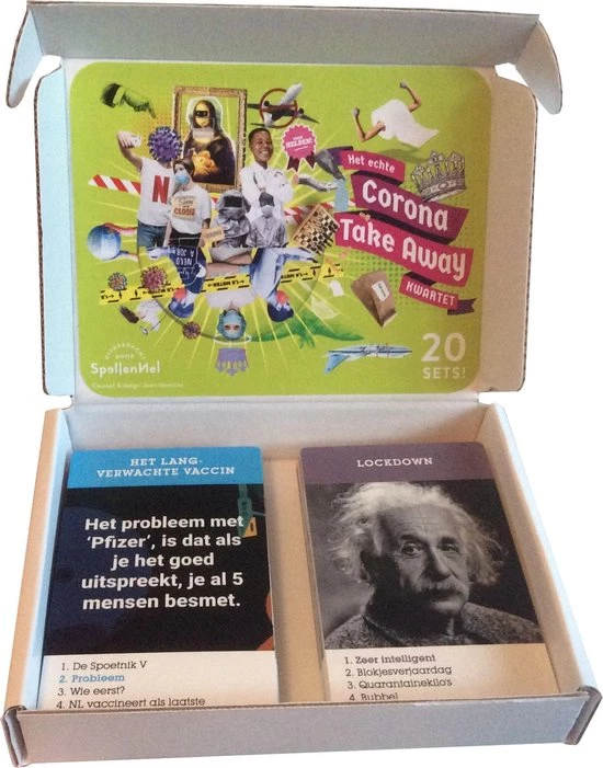 Deze gevaccineerde editie van het Corona Take Away Kwartetspel is een knipoog naar coronatijd. Het kwartetspel is extra large en bevat maar liefst 20 sets. Veel grapjes die afgelopen twee jaar via socialmedia werden verspreid zijn in dit spel verwerkt.