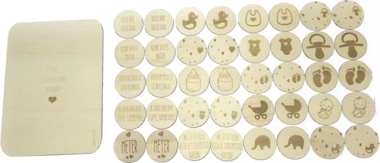 Hoe leuk en origineel is dit!Een memoryspel om Meter te vragen!20 verschillende afbeeldingen (40 plaatjes)diameter memory stenen: 4 cmHet spel is verpakt in een doosje (180x130mm) met houten kaart met tekst: Psst..ik wil je iets vragen.