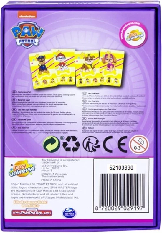 Tactic Paw Patrol kwartetspel Dit leuk en herkenbaar geïllustreerde kwartetspel is speciaal gemaakt voor de allerkleinsten. Boven aan de kaarten staan vier duidelijke afbeeldingen van Paw Patrol. Speel jouw kwartet bij elkaar en win dit leuke kwartetspel! Specificaties: Kleur: multicolor Materiaal: karton Geslacht: junior Taal: Nederlands Afmetingen verpakking: 12,5 x 12,5 x 4 cm (lxbxh) Aantal spelers: 2-4 spelers Geschatte speeltijd: 20 minuten Leeftijd: vanaf 4 jaar Inhoud: 32 Kwartetkaarten Spelregels