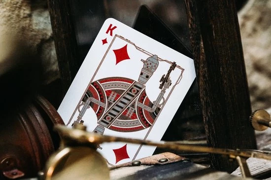 Dit is de weg. Mandalorian speelkaarten. Het ontwerp is adembenemend, met Beskar-staal, spacezwart en opvallende rode folies die de buitenverpakking bedekken – en een 3D-reli?f van de Mandalorian-helm.