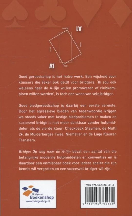 Goed gereedschap is het halve werk. Een wijsheid voor klussers die zeker ook geldt voor bridgers. `Ik zou ook weleens naar de A-lijn willen promoveren of clubkampioen willen worden’, is toch een wens van vele bridger. Goed biedgereedschap is daarbij een eerste vereiste. Door het agressieve bieden van tegenwoordig krijgen we steeds vaker met lastige biedproblemen te maken en succesvol bridge is niet meer denkbaar zonder hulpmiddelen als de vierde kleur, CheckBack Stayman, de Multi 2, de Muiderbergse Twee, Niemeijer en de lage kleuren Transfers. Bridge: Op weg naar de A lijn bevat een aantal van die belangrijke moderne hulpmiddelen en conventies en is daardoor een onmisbaar boek voor iedere speler die zijn kennis wil vergroten en een succesvol bridger wil zijn.