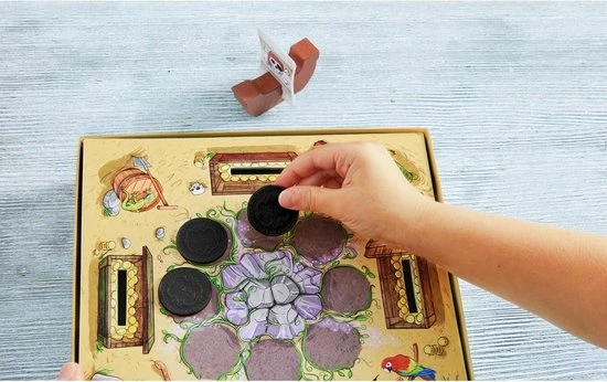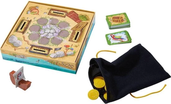 - Inhoud: 1 piratenschip (scheepsromp en kartonnen zeil),1 schateiland (= onderkant van de doos met 2 scheidingswanden + 1 spelbord), 1 stoffen zakje, 50 muntstukken (42 gouden munten, 8 zwarte munten), 40 schatkistkaarten (35 gevulde schatkisten en 5 lege schatkisten), 13 papegaaikaarten, 1 handleiding.