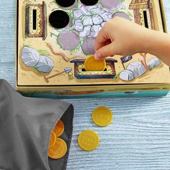 Verzamelspel Het vervloekte piratengoud is een leuk en spannend gezelschapsspel tot op het einde. Moedige avonturiers hebben op een geheimzinnig eiland een zak vol goud gevonden. Tussen de goudstukken bevinden zich helaas ook vervloekte munten, die de gevreesde piratenkapitein Black laat komen. Wie met wat geluk de meeste goudstukken uit het zakje haalt en in zijn houten kist verbergt, wint. Wees op jullie hoede voor het vervloekte zwarte piratengoud!