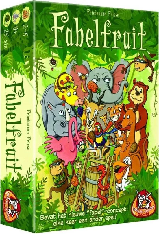 Er was eens een wonderbaarlijk bos met heerlijk fruit. Jullie leven in dit bos en gaan op zoek naar het smakelijkste fabelfruit. Vriendelijke inwoners van het bos helpen jullie bij het zoeken. Wie lukt het om als eerste zijn honger stillen? Fabelfruit bevat een uniek spelconcept: het spel verandert elke keer als je het speelt! De startopstelling van elk volgend spel is namelijk gelijk aan hoe het vorige spel is ge?indigd. De regels blijven hetzelfde maar de acties evolueren. In elk spel komen er wel ??n of meer nieuwe actiemogelijkheden bij. Na ongeveer 20 keer heb je het spel uitgespeeld maar daarna kun je weer zonder problemen opnieuw beginnen.Een zeer bijzondere ervaring om met je spelersgroep of het hele gezin mee te maken!
