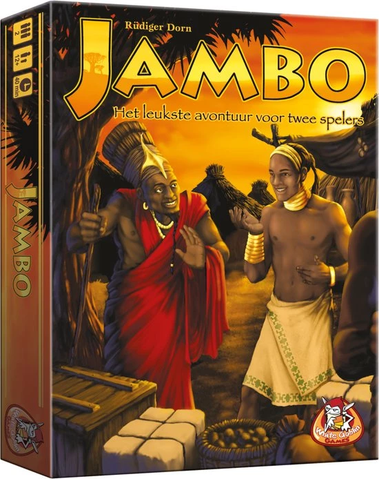 ?Jambo? betekent ?hallo? in het Swahili. Zo begroeten gewiekste handelaren hun kooplustige klanten. Het hart van Afrika kent al sinds eeuwen een bloeiende handelscultuur. Handelsgoederen komen van heinde en verre, om vervolgens verhandeld en in goud omgezet te worden. De spelers zijn handelaren en proberen goede zaken te doen door slim te in- en verkopen. Winnaar is de speler die aan het einde van het spel het meeste goud heeft. Het leukste avontuur voor 2 spelers is terug! Deze vernieuwde uitgave van White Goblin Games komt in een mooi tinnen blik. De maar liefst 112 speelkaarten zorgen voor enorm veel variatie! De uitbreidingssets Jambo Uitbreiding 1 en Jambo Uitbreiding 2 die in Nederland zijn uitgegeven via QWG Games zijn uitstekend te combineren met deze vernieuwde versie van White Goblin Games. Tevens is Asante met Jambo te spelen.