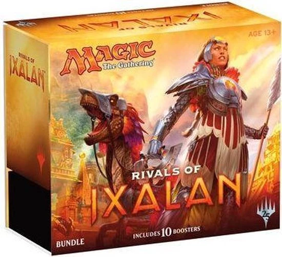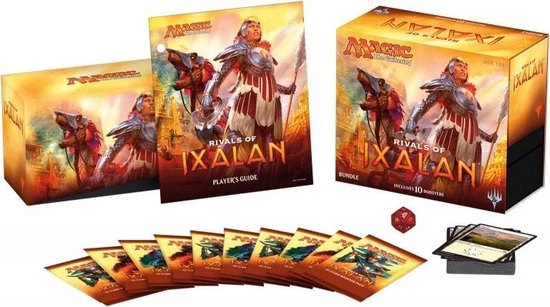 1 Rivals of Ixalan Bundle bevat 10 Rivals of Ixalan boosters, 1 kaartendoos, 1 spelers handleiding, 1×80-card land pakket, 1 learn-to-play handleiding, 1 Spindown? life counter en 2 deck boxes.
